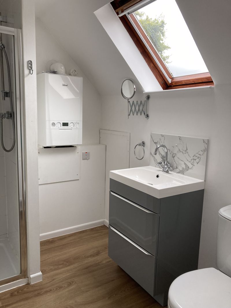 Fitted with 3-piece suite, including large shower cubicle with mixer shower, aqua boarding glazed screen, wood effect laminate flooring, corner vanity unit with wash basin and storage and laminate mantle, WC, double-glazed window to the side, built-in double airing cupboard with sliding doors housing hot water cylinder.Garage 17' 11'' x 13' 1'' (5.46m x 3.98m)