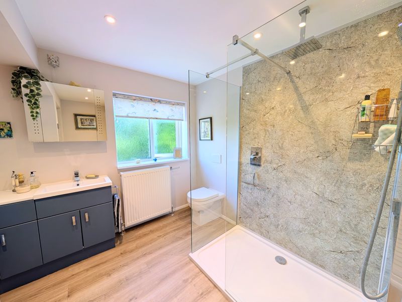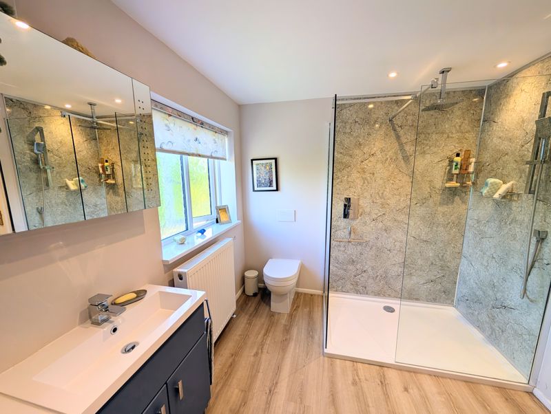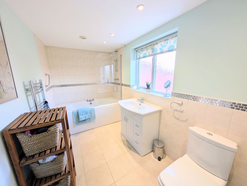 Fitted with white 3-piece suite including bath, WC, wash basin set to vanity unit with storage beneath, tiled flooring, wooden double-glazed window to the rear, radiator, chrome towel radiator, extractor fan.Shower Room 11' 2'' x 9' 7'' (3.40m x 2.92m)
